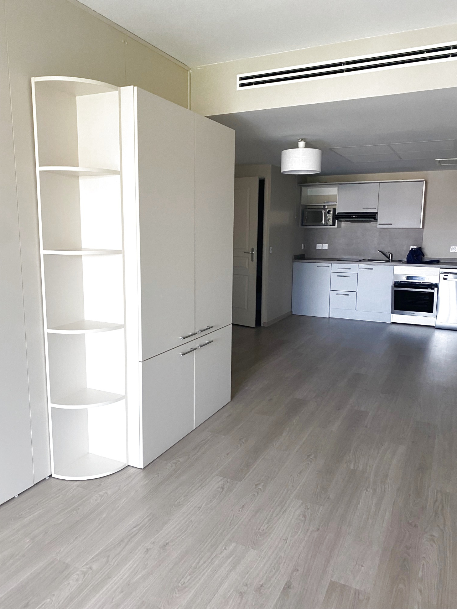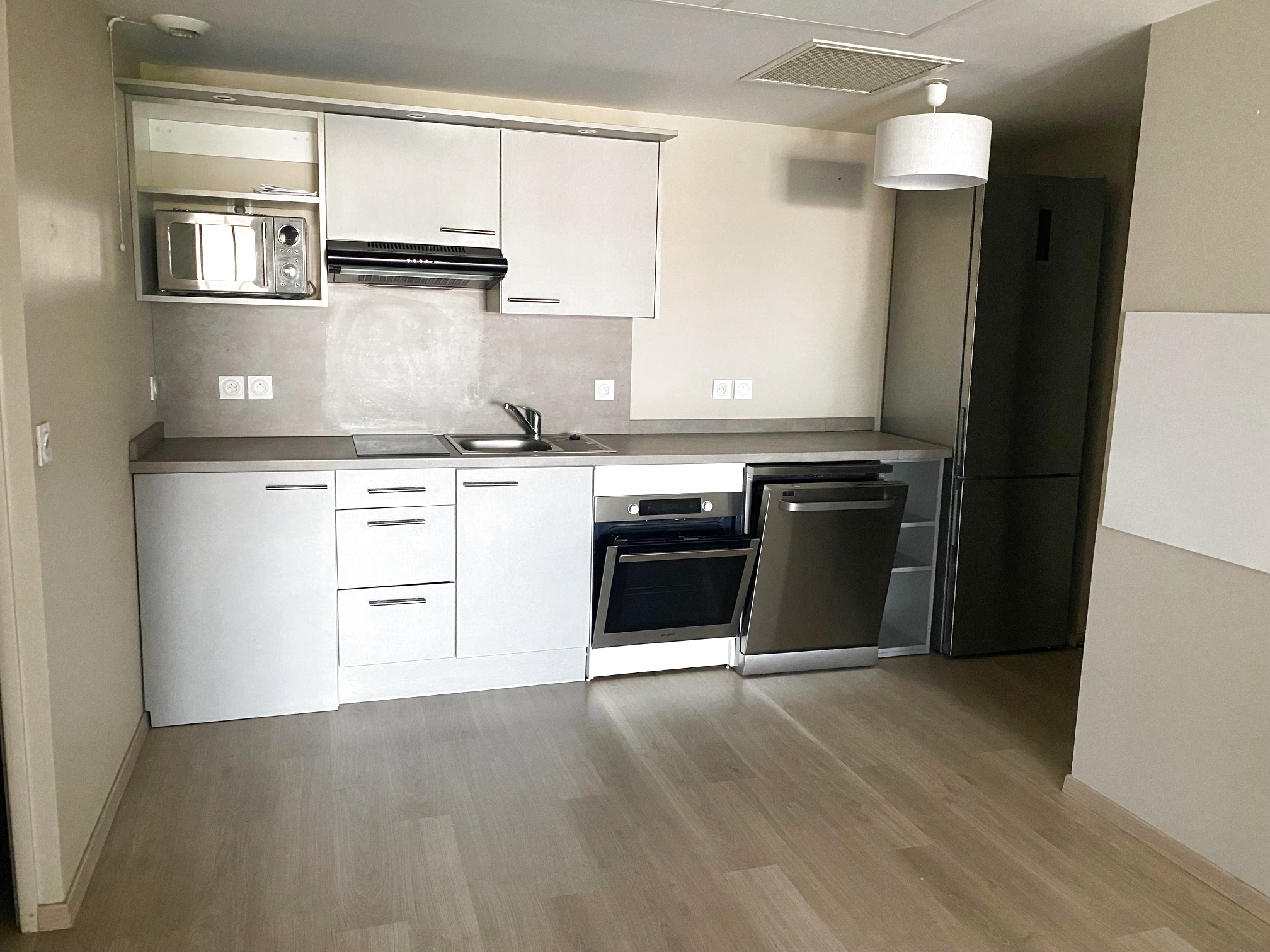 Ce logement se compose d'un séjour, une cuisine équipée, une chambre, une salle d'eau avec douche à l'italienne et w.-c. La pièce de vie donne sur deux balcons, et il est vendu avec une place de parking dans la résidence.